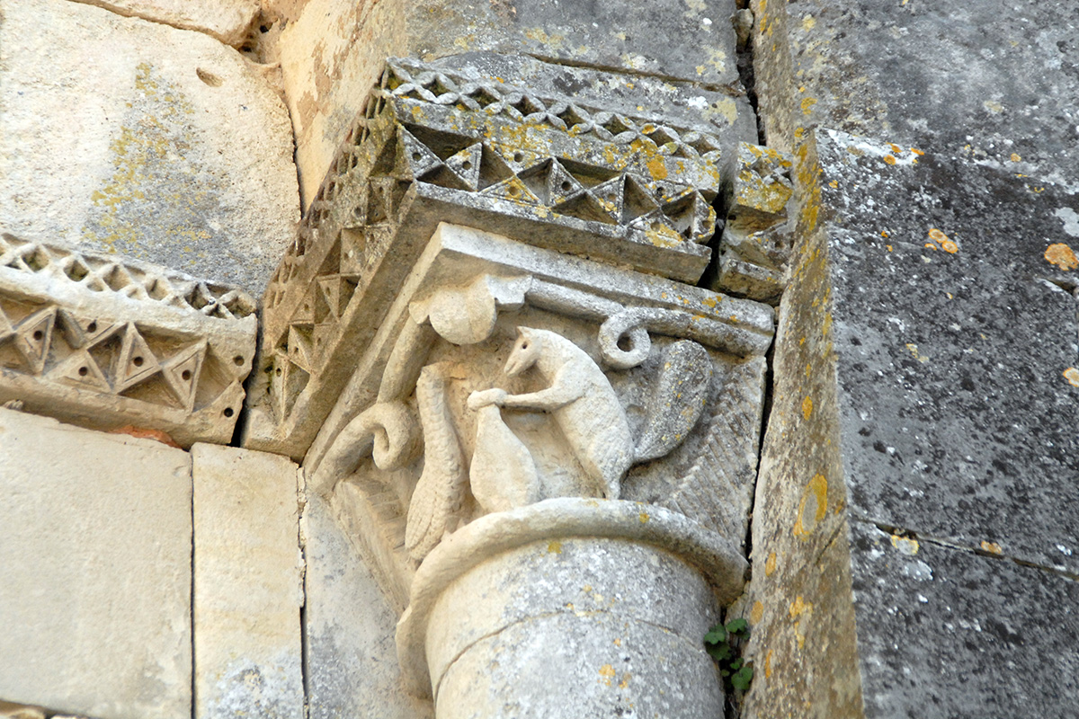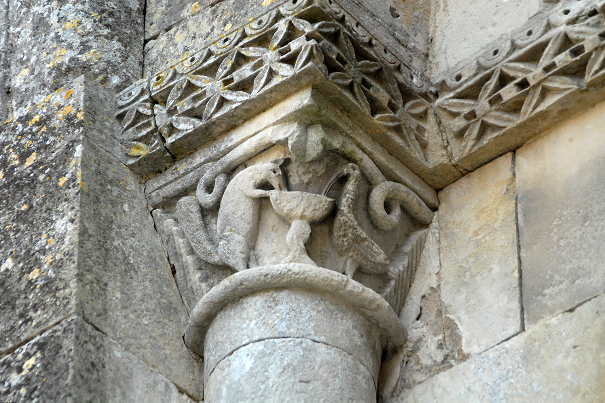 Comme à Grézac, un chapiteau extérieur reprend le thème du Renard et de la Cigogne, en référence à la fable d’Ésope.