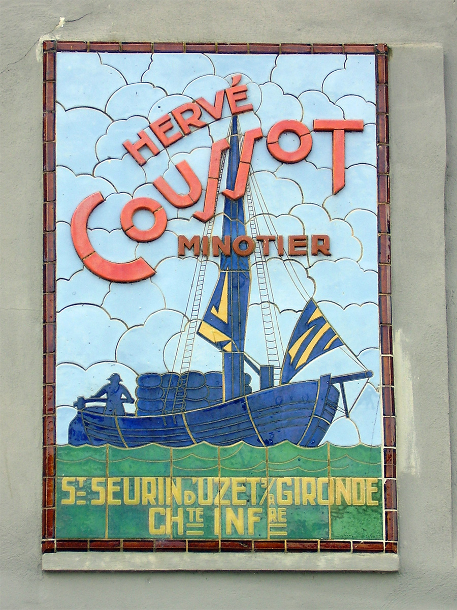 Cette céramique polychrome se trouve aujourd'hui sur le mur de refend de la minoterie Coussot de Saint‑Seurin‑d'Uzet, car la façade où elle se trouvait à l'origine s'est écroulée en 1995. La mosaïque représente une gabare, navire de transport de marchandises sur l’estuaire, chargée de farine. C’est le seul exemple de céramique en Pays Royannais.