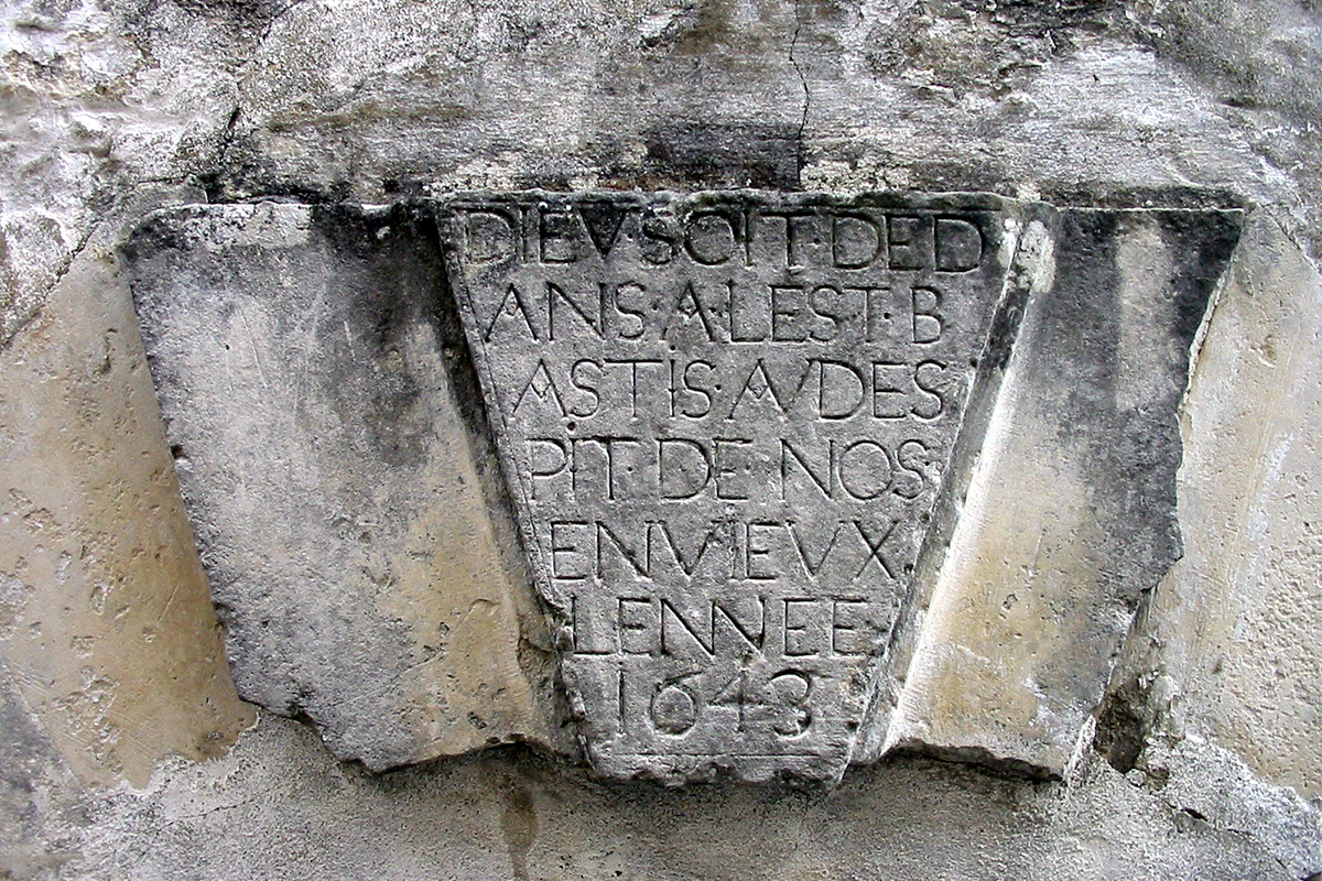Le fronton de cette maison particulière présente un linteau avec une inscription gravée : "Dieu soit dedans, elle est bâtie en dépit de nos envieux, l’année 1643"