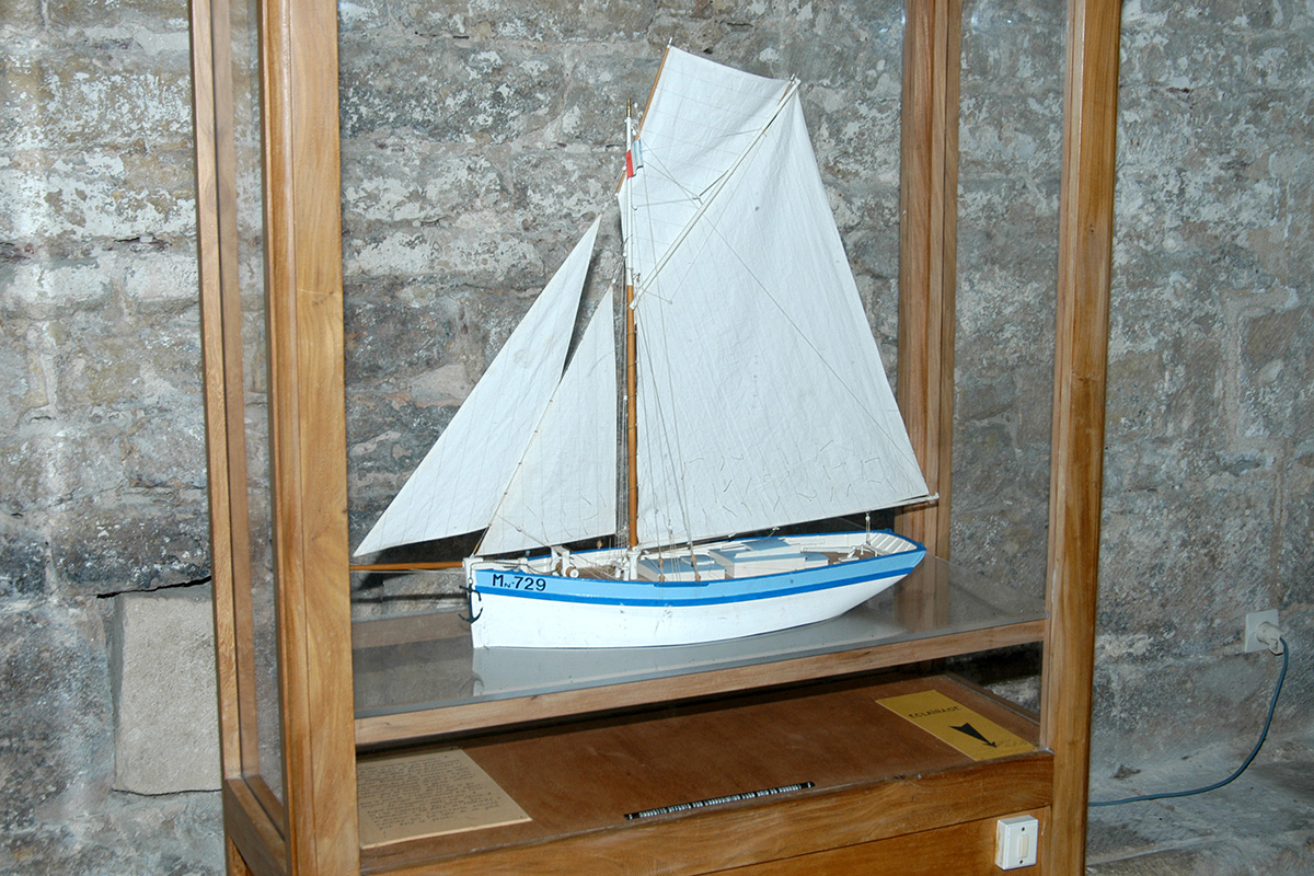 Réalisée en 1970 par M. Chapron, cette maquette représente un bateau de pêche construit en 1910 aux chantiers Brochon. Bien que dans l’église, ce n’est pas un ex‑voto (objet suspendu à la suite d’un vœu ou d’une grâce), mais un simple don d’un fidèle.