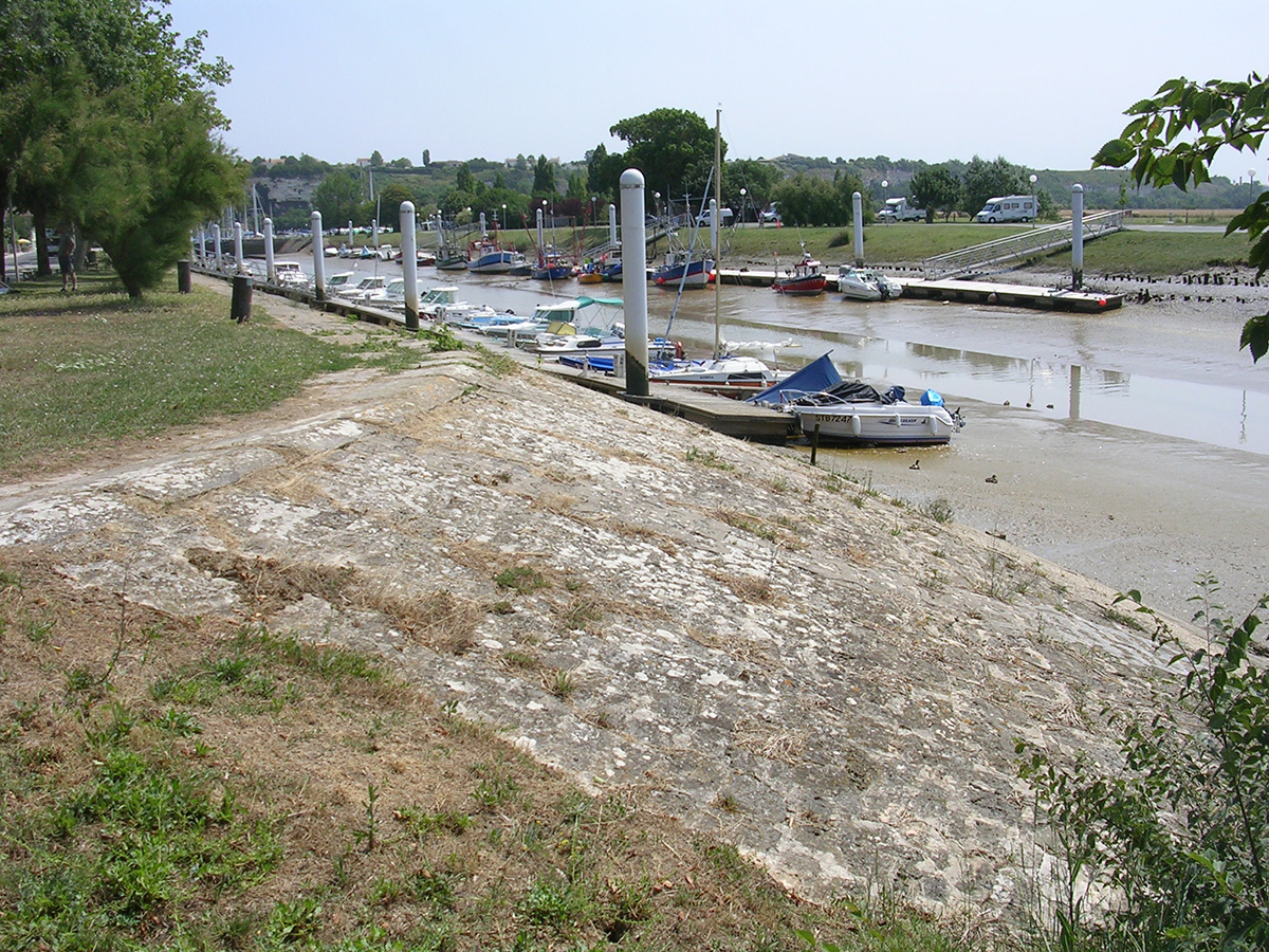 Perré protégeant la levée de la rive droite construite entre 1846 et 1854. Le perré est situé sur la rive nord de l’avant‑port entre l’ancien port à sable et la cale de construction. Son faîte en pierre de taille est suivi de trois rangs de pavés. Des bollards de pierre sont dressés régulièrement en retrait de son sommet. Pour la partie construite en 1861, le perré est en lits réguliers de pierre de taille. Le faîte est en pierre de taille maçonnée, l’appareil est grand et régulier. Pour la partie réalisée plus tardivement, le perré est en gros moellons disposés en opus incertum. Le perré est maintenant doublé d’appontements flottants.