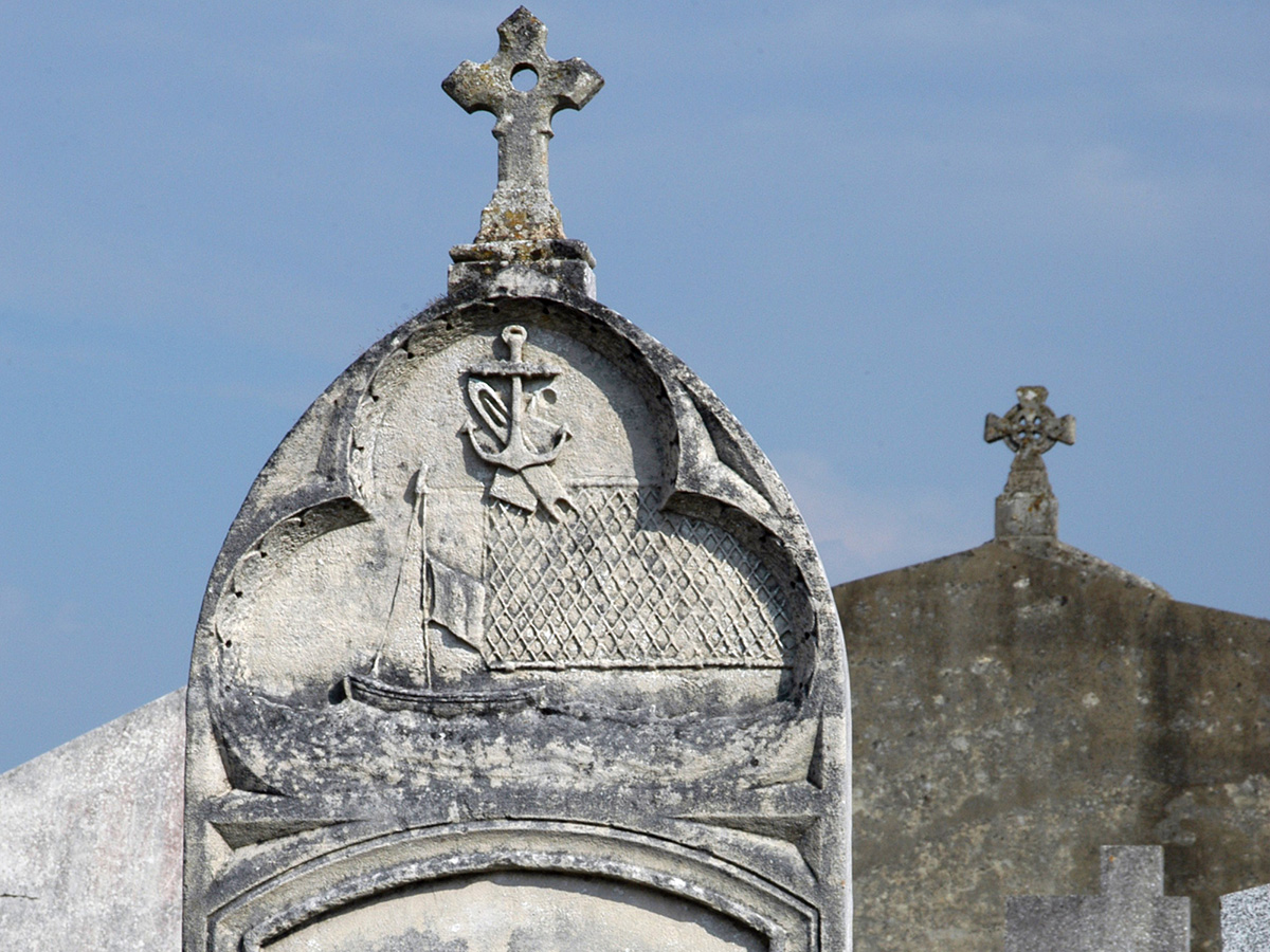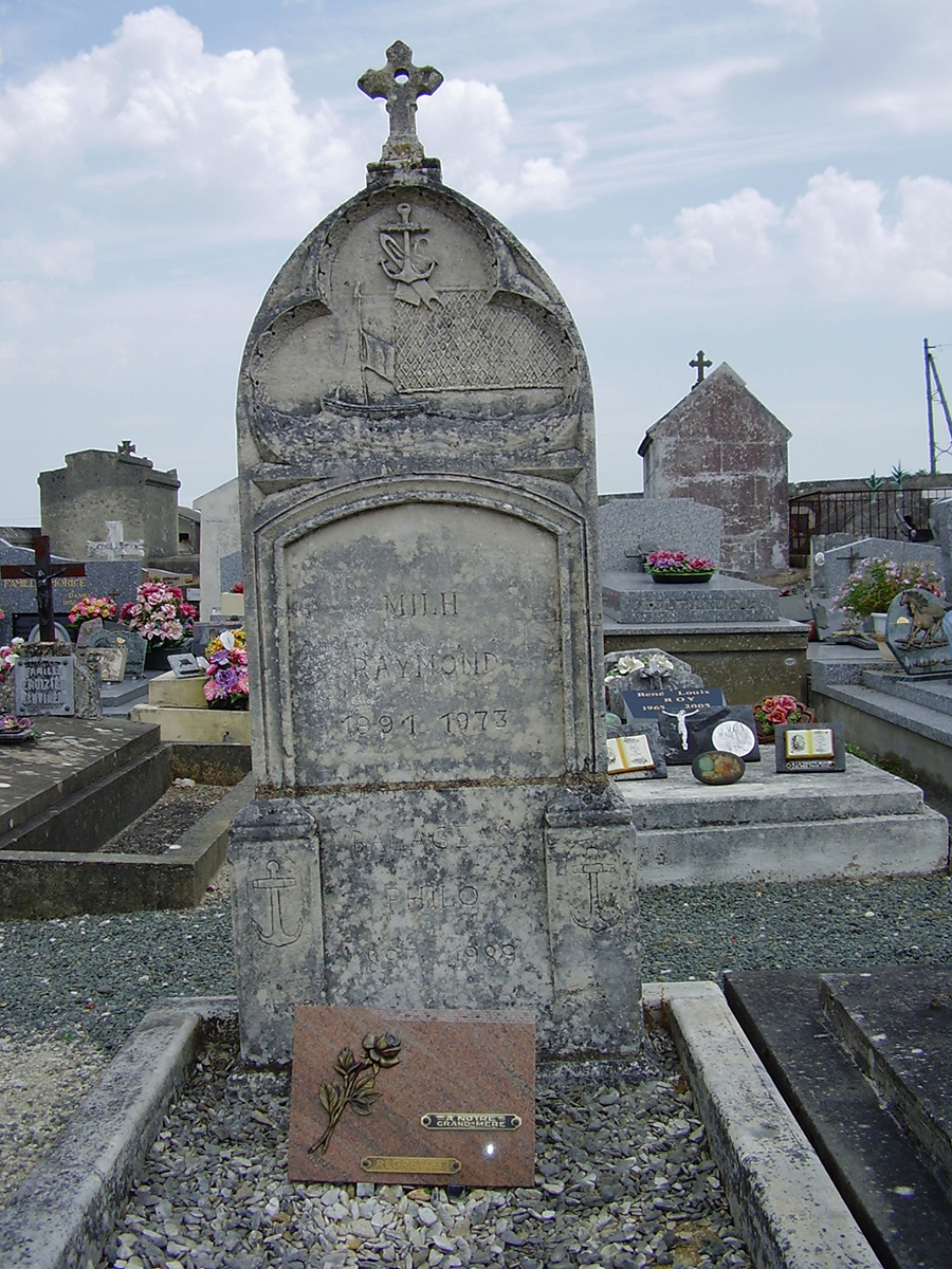 Stèle de Raymond Milh, cette pierre tombale présente dans sa partie supérieure une sculpture rappelant la profession de pêcheur du défunt. Est ainsi représentée une filadière, bateau de pêche de l’estuaire de la Gironde, remorquant un esturgeon. Raymond Milh et sa famille étaient en effet de fervents acteurs de la pêche à l’esturgeon et de la préparation du caviar.