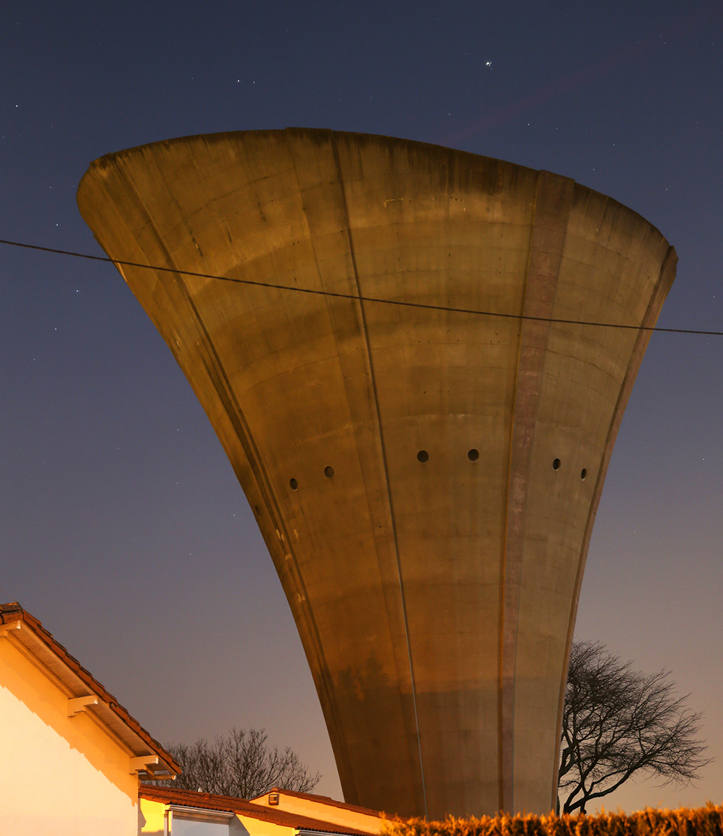 Ce château d’eau à la corolle tronquée fait partie d’un ensemble de châteaux d’eau construits sur les hauteurs périphériques de la ville après la Seconde Guerre mondiale.