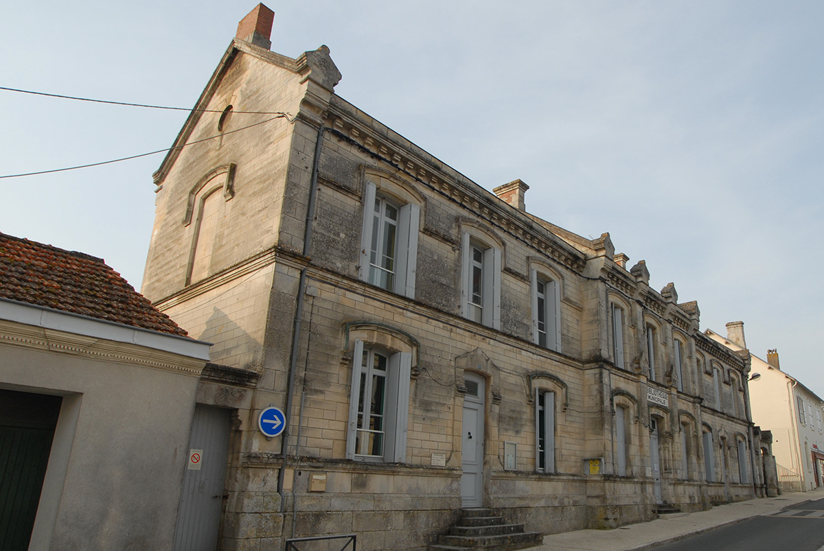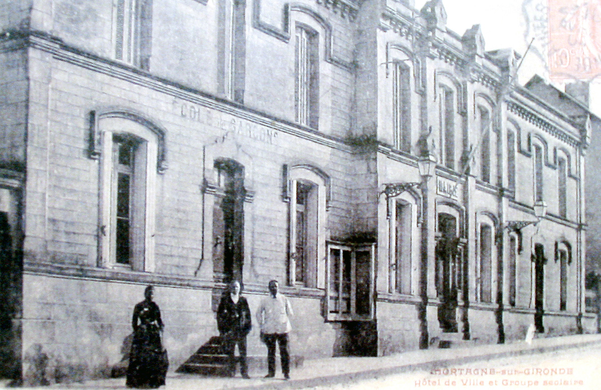 La municipalité de Mortagne‑sur‑Gironde possède depuis le 19e siècle une école pour filles et une école pour garçons, sans pour autant avoir ses propres bâtiments. En 1860, la municipalité fait l’acquisition d’une maison pour y installer ses bureaux, le logement de l’instituteur et y crée une classe pour garçons en fond de cour. Les travaux sont menés par l’architecte Aimé Bonnet qui interviendra de nouveau en 1875 et en 1878 : l’intervention du même architecte sur les différentes phases a permis de donner un aspect homogène au bâtiment. La façade présente une construction tripartite, rappelant la division parcellaire d’origine. La présence de trèfles sur les amortissements de toiture est la signature de l’architecte.