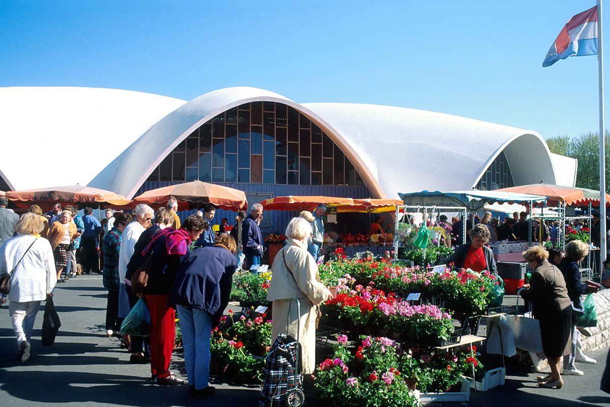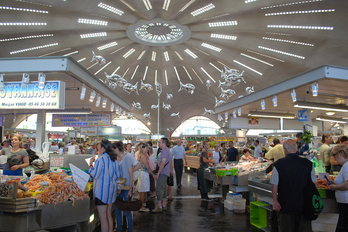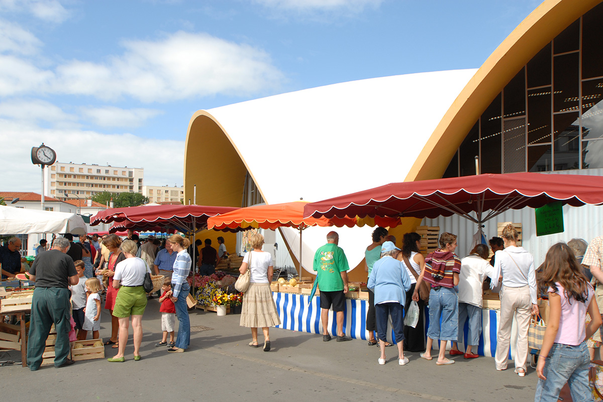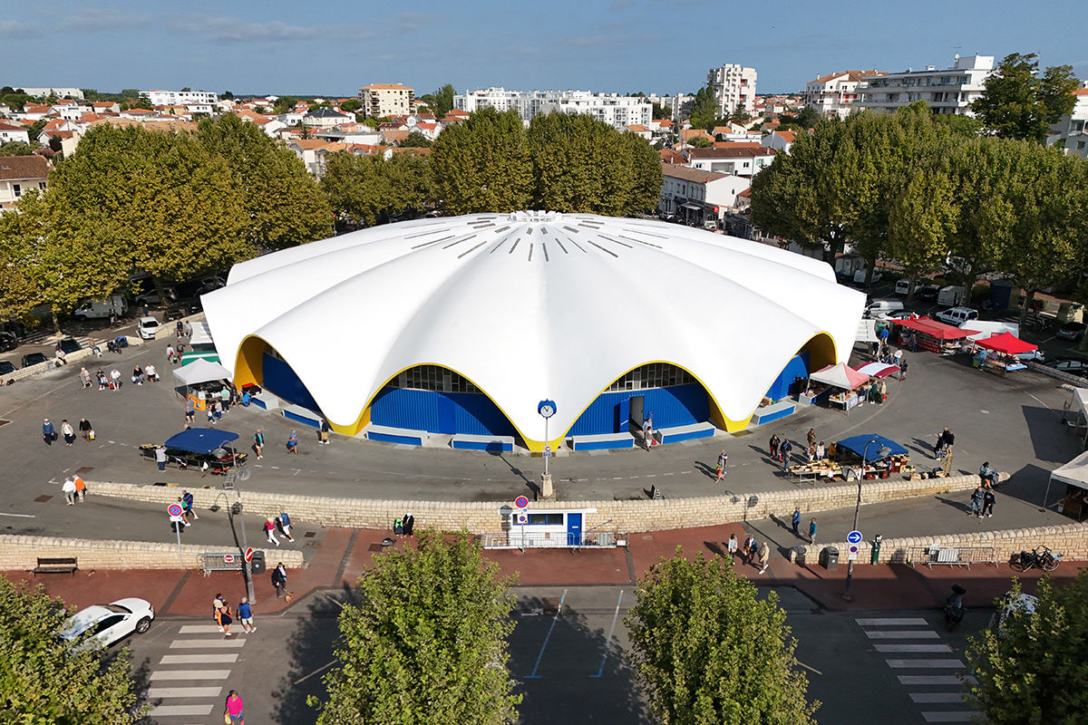 Comptant parmi les monuments emblématiques de la Reconstruction de Royan, le marché central est le fruit de la collaboration entre les architectes Morisseau et Simon et l’ingénieur Lafaille. C’est ce dernier qui propose, comme pour l’église Notre‑Dame, un voile de béton de 10 cm d’épaisseur en guise de couverture, prenant appui sur seulement 13 points. La prouesse architecturale réside en l’absence de pilier intérieur soutenant la voûte, laissant ainsi un vaste espace largement ouvert pour la vente, empli de lumière naturelle traversant les briques de verre et les ouvertures de la voûte.