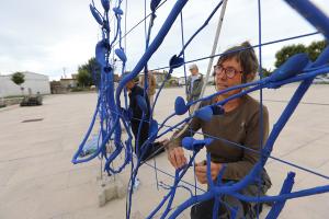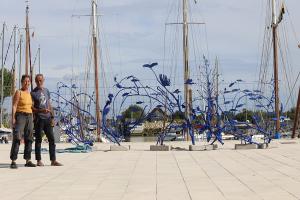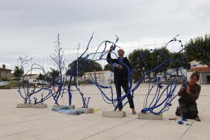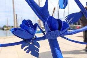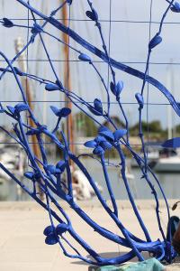 L’oeuvre un monde hybrise se place à la limite entre terre et mer. Pour répondre à l’univers de Verlaine, une fantasmagorie peuplée de chimères poétiques qui marie le monde marin au monde terrien, abolit la frontière entre les airs et les profondeurs océanes, entre le réel et l’imaginaire. C’est une vague de vie qui déferle, vêtue d’un bleu lumineux et dense, proche du fameux IKB, le bleu Klein, symbole parfait d’infinité. Le promeneur, bercé par la beauté du paysage, se laisse transporter par le rêve où les limites entre la terre et la mer se brouillent et découvre la forme buissonnante, naturelle, peuplée de vie animale et végétale. Une longue liane dotée de nageoires semble onduler, un rameau ailé, des pinces de tourteau qui fleurissent au bout d’une branche alors que passent papillons et poissons dans un monde plein d’une vie presque inquiétante.