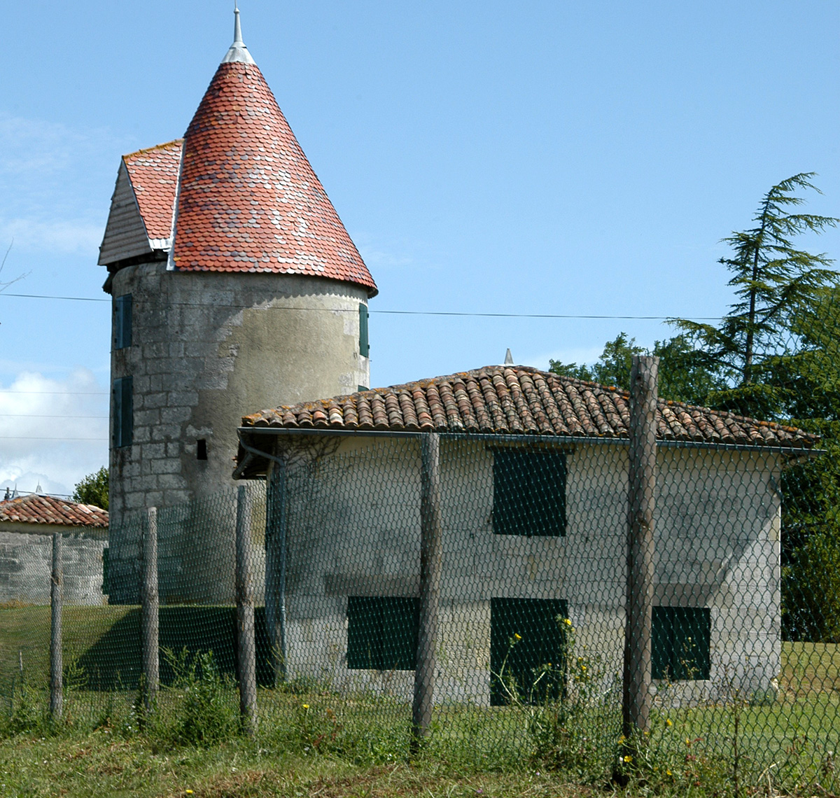 Présent sur le plan cadastral de 1832, le logis Les Charmilles est une maison de meunier anciennement associé à un moulin à vent, propriété de la famille Vérat dès le 18e siècle. En 1859, le bâtiment est reconstruit par Pierre Vérat dans le style des demeures saintongeaises. Vérat fonde sa minoterie en 1864 et pour éliminer la concurrence, il rachète tous les moulins environnants. La légende veut que Pierre Vérat ait planté des charmilles dans l’entrée de Mortagne, coupant ainsi le secteur de vent de ses concurrents afin d’acquérir leurs moulins à bas prix. Le moulin encore présent aujourd’hui est le dernier acquis : propriété du boulanger Boulerne, celui‑ci accepte de le vendre à Vérat à condition qu’il ne le démolisse pas.