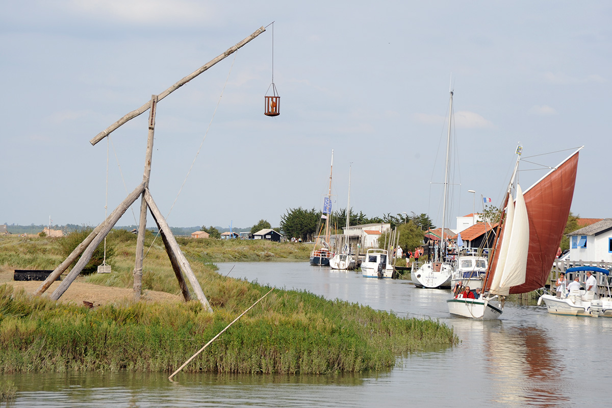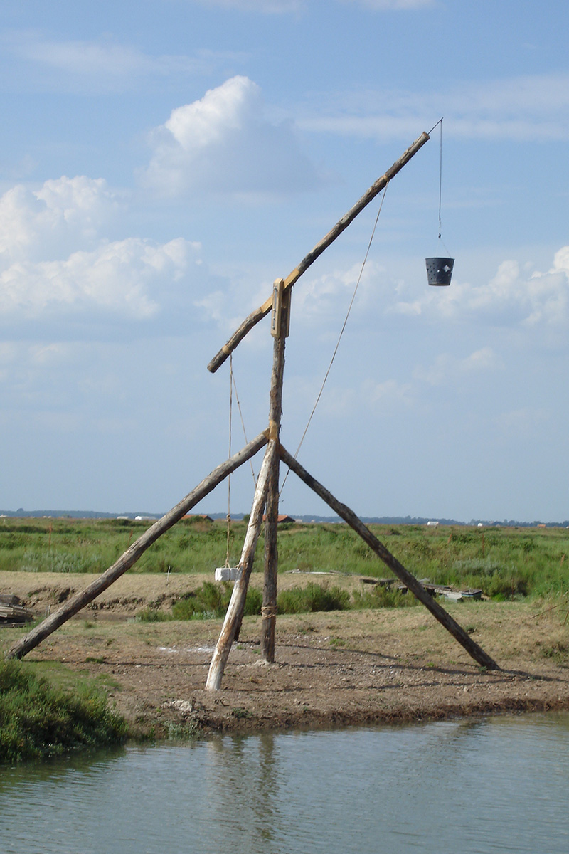 De dimensions modestes, à l’image des réalisations du Moyen‑Âge, la réplique du feu médiéval édifiée sur le marais de la Seudre, est une structure très rudimentaire, inspirée de pratiques scandinaves. Elle est faite de troncs d’arbres assemblés soutenant un balancier à contre‑poids doté à son extrémité supérieure d’un réceptacle permettant l’entretien d’un feu de nuit et de fumée le jour.
