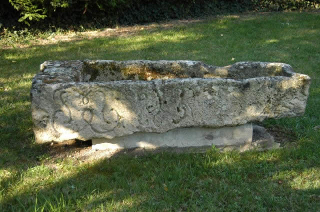 Ce sarcophage situé face à l’église est peut‑être un sarcophage mérovingien. Un de ses côtés présente un ensemble de motifs sculptés abstraits.