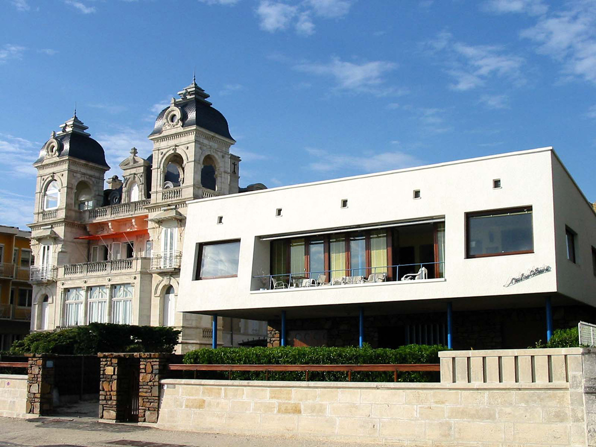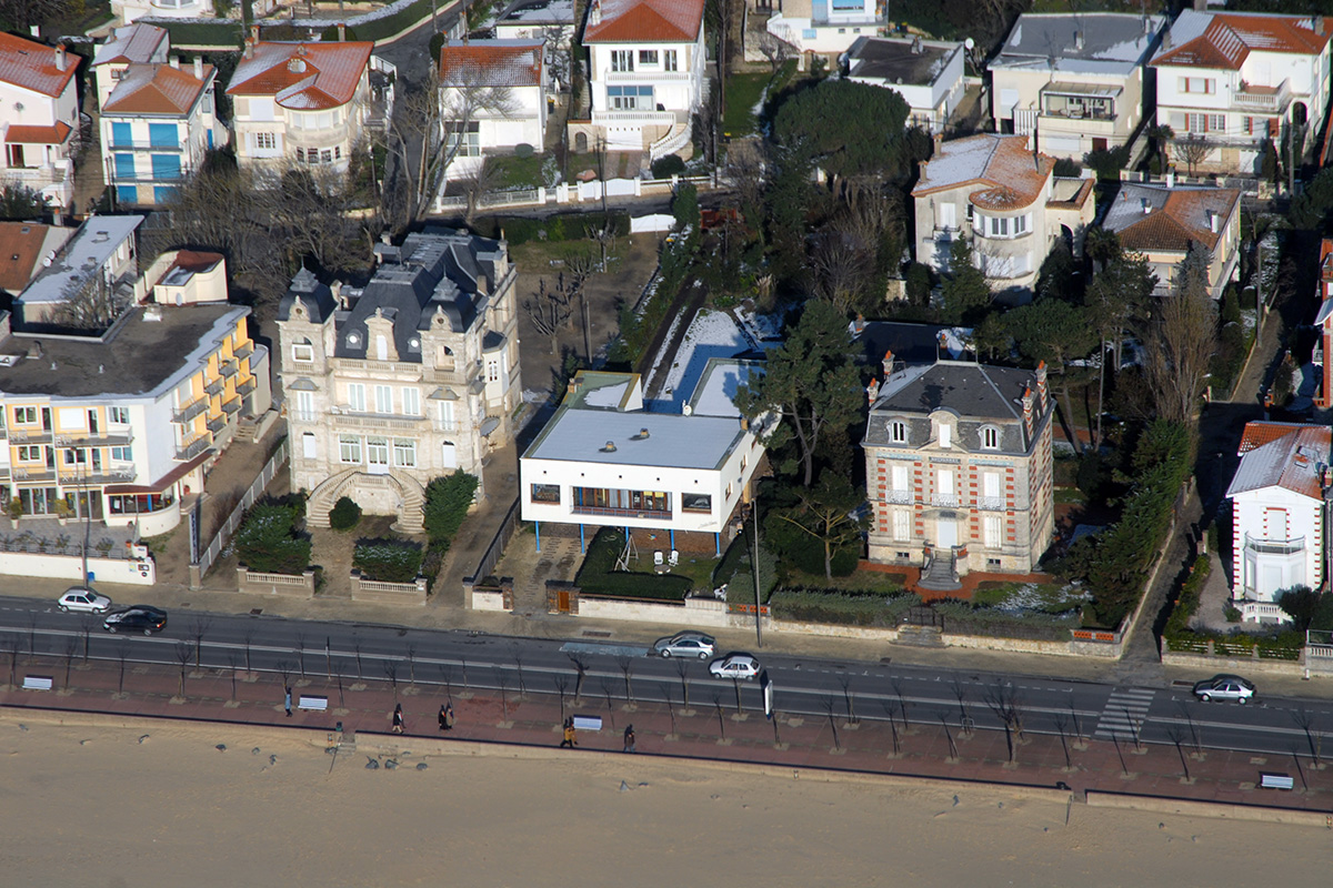 Implantée entre deux villas Belle‑Époque, la villa Ombre Blanche mêle deux influences de son temps. Elle semble inspirée de la villa d’Oscar Niemeyer à Brasilia, notamment avec son toit à pans inversés.
